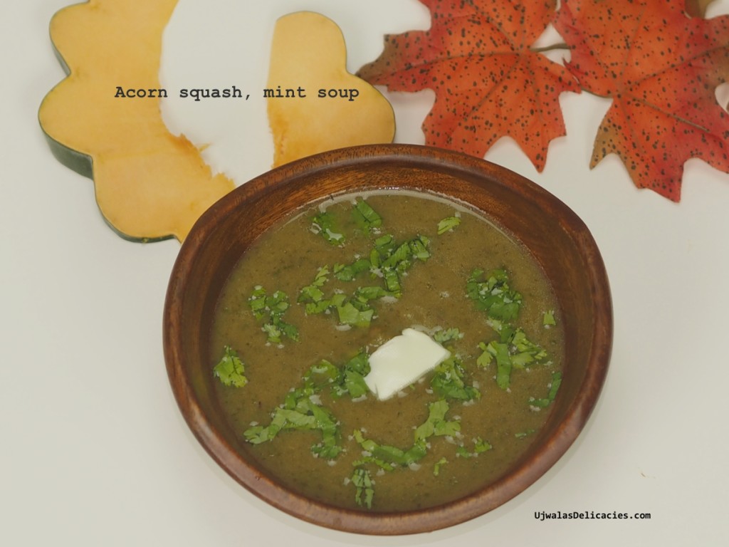 Recipe by Ujwala's Delicacies at https://www.ujwalasdelicacies.com/acorn-squash-mint-soup-stock-free-vegan-gluten-free/